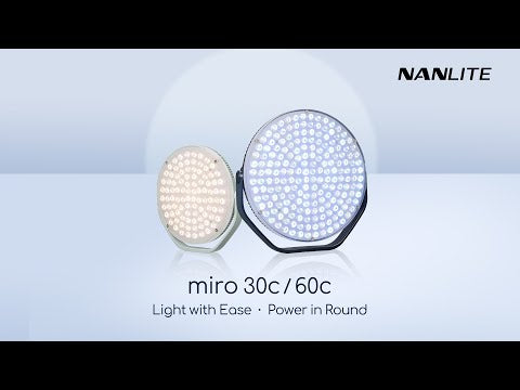 The Nanlite Miro 60c is the larger sibling of the Miro 30c, offering more power and a bigger light source while still keeping things slim, stylish, and portable. Measuring just under 23cm across and weighing only 0.74kg, it’s easy to carry and set up, yet produces a bright 8382 lux output at 1m (5600K). With the same Nebula C4 RGBW engine at its core, the Miro 60c gives you full-colour flexibility, 14 built-in effects, and a magnetic diffuser for flattering soft light. Control it directly on the unit or wirelessly via the NANLINK app, and power it from mains, USB-C, or optional dual NP-F batteries. Whether you’re filming, streaming, or shooting stills, the Miro 60c provides more punch in a compact package.