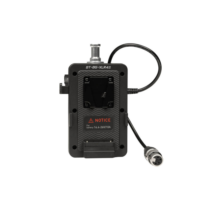 It holds a single V-Mount battery (sold separately) and has a built-in D-Tap cable to connect the battery. There's also a short built-in cable with a locking female 4-pin XLR connector to plug directly into your light. It's ideal for handheld lighting setups or creating a compact, stand-mounted solution on location or in the studio.