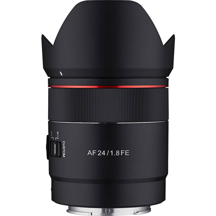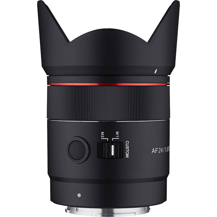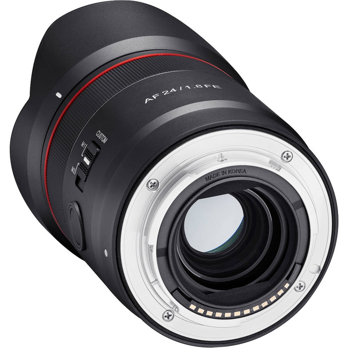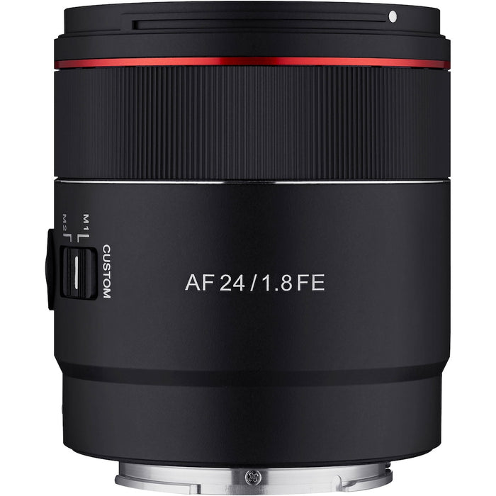 The AF 24mm F1.8 FE weighs only 230g(8.1oz) and 71.5mm(2.8in) in length. Small size and lightweight enhance mobility when used with compact E-mount mirrorless cameras. Its matte finishing with the laser engraved font provides better readability and the tactile mounting index adds to the convenience of the users. Also features weather sealing for 5 spots to protect from light dust, rain and snow and provide the ability to capture stunning images in less than perfect conditions.