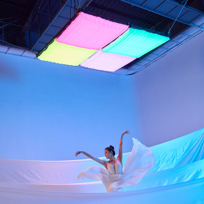 The KNOWLED RGB F-Series comes in five sizes, all compatible with industry-standard diffusion fabrics and truss systems. These sizes can be combined to create custom lighting setups, and each one folds down for easy storage and transport. The sizes include: