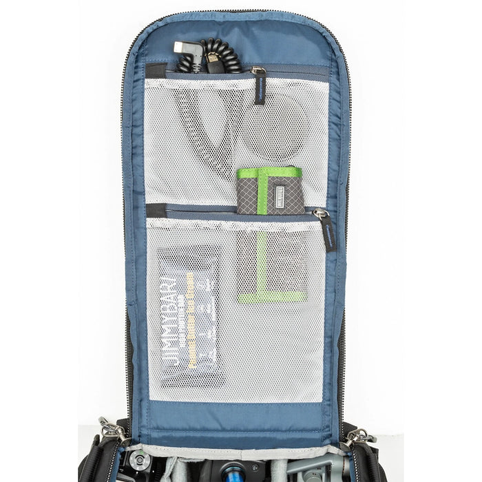 Inside, the bag features a versatile divider system with cushioned pillows that contour to your gear for safe transport. Mesh pockets and organiser panels help keep batteries, memory cards, filters, and small essentials neatly arranged. The front compartment offers plenty of space for personal belongings like jackets or snacks.